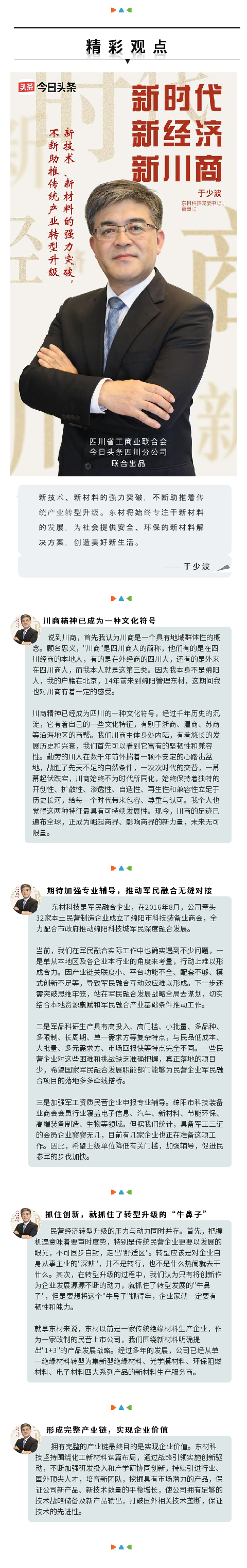 作為川內新材料行業的排頭兵、國內絕緣材料企業領軍企業的帶頭人,日前,四川東材科技集團股份有限公司公司黨委書記、董事長于少波作為新川商代表接受了《今日頭條》的專訪,分享了他對于新川商、軍民融合產業發展、民營企業轉型升級的看法以及未來規劃等內容。