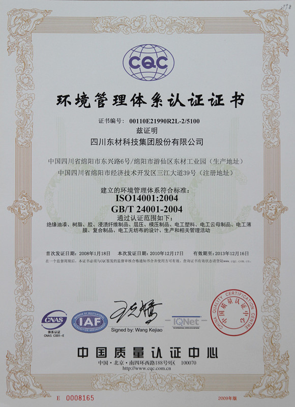 東材科技在國內同行業企業當中率先通過國際ISO9001的質量體系認證,通過ISO10012國際計量體系、ISO14001環境管理認證體系、OHSAS18001職業健康安全體系、GBT 29490知識產權管理體系、GBT23331能源管理體系認證企業、IATF16949汽車質量管理體系認證,不僅使公司產品質量保障體系達到國際化的新標準,而且為產品質量的穩定提供了強有力的保障。